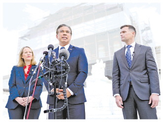 | 当地时间11月5日,美国华盛顿特区,美最高法院就政府关税政策合法性举行听证会后,加州司法部长罗伯·邦塔(中)等人在最高法院外向媒体发表讲话。 CFP供图 |