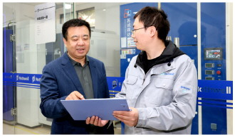 | 图为全国人大代表周善红(左)在江苏某电气公司调研。 |