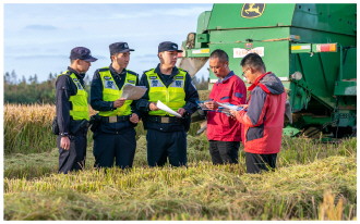 十一月十一日,上海市公安局崇明分局长江派出所组织民辅警走进田间地头,向收割晚稻的农户们开展防盗防骗、交通安全提示等宣防工作。 本报通讯员 沈群 摄