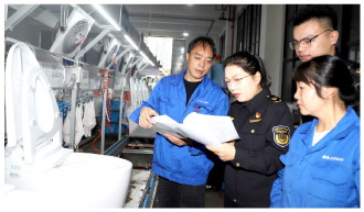 今年“双11”期间,浙江省台州市路桥区市场监督管理部门加强对产品质量的监督管理,切实维护消费者权益。图为11月11日,台州市路桥区路北街道市场监督管理所工作人员在一家智能马桶生产企业检查并宣传相关法律法规。 本报通讯员 蒋友亲 摄