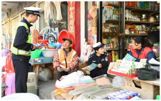 ▲ 安徽省含山县公安局交管大队近日组织民警对沿街商铺开展交通安全宣传。图为民警向群众讲解交通安全知识。 本报通讯员 冯善军 摄