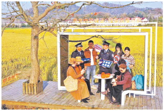 ▲ 近日,安徽省舒城县公安局网监大队民警与阙店派出所民警来到转水湾村“稻田树下”打卡点,开展打击整治网络谣言宣传活动。图为民警向游客普及相关法律知识。 本报通讯员 王可海 摄