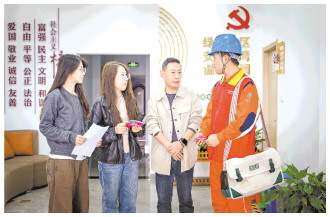 近日,国网浙江电力(衢州)红船共产党员服务队走进浙江省江山市双塔街道文苑社区,开展电力普法宣传活动。图为服务队队员向社区网格员讲解安全用电和电力设施保护知识。