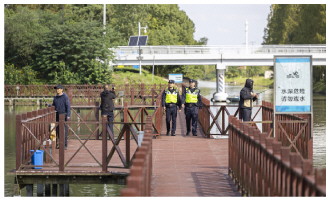 近日,上海市公安局崇明分局建设派出所民警在河道周边开展动态巡逻,并向垂钓爱好者宣传生态保护法律法规。图为巡逻现场。 本报通讯员 沈群 施大为 摄