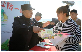 11月20日,江西省九江市公安局濂溪分局森林警察大队联合区林业局、区应急管理局、街道办事处等单位开展“情系一片绿 心防一把火”主题宣传活动。图为民警和相关单位工作人员向群众普及防火知识。 本报通讯员 游建栋 摄