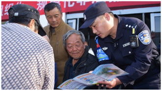 近日,江苏省宿迁市公安局湖滨新区分局开展防范非法捕捞宣传进社区活动。民警结合典型案例向当地群众讲解非法捕捞的危害及法律责任,提升群众的生态环境保护意识。图为民警向群众普及相关法律知识。 本报记者 罗莎莎 本报通讯员 孙明建 摄
