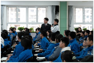 ▲ 近日,甘肃省兰州市城关区人民检察院检察官走进辖区中学,开展法治副校长送法进校园活动。图为检察官与学生互动,宣讲如何防范校园欺凌。 本报通讯员 城检宣 摄