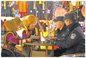 | 图为青海省海东市互助土族自治县公安局东和派出所民警近日在油嘴湾景区开展普法宣传。