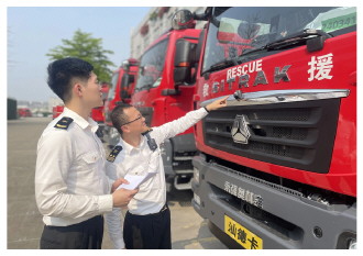 今年以来,黄埔海关所属太平海关通过“关长送政策上门”等机制,深入企业现场“问诊”,加大相关政策法规及技术性贸易措施的指导力度,最大化便利企业合规办理各项手续,畅通企业出海“最后一公里”。图为黄埔海关所属太平海关关员正在核对辖区一家消防车辆生产企业的出口消防车相关车辆信息。 本报通讯员 李靖远 王应光 摄