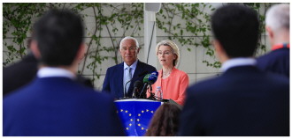 | 当地时间11月24日,欧洲理事会主席科斯塔(左)和欧盟委员会主席冯德莱恩就乌克兰问题举行联合发布会。