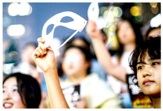 | 图为韩国民众手举面具在首尔举行抗议集会,敦促政府遏制涉及深度伪造技术的犯罪活动。
