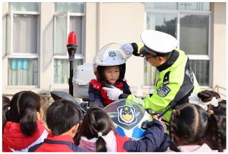 江苏省淮安市公安局洪泽分局交警大队民警近日走进辖区幼儿园,开展“文明交通 礼行天下”主题活动。民警通过讲解交通安全知识、开展互动游戏、展示警用装备等,提高小朋友知险避险能力。图为交警向小朋友讲解如何正确佩戴头盔。
