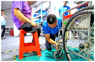 | 图为全国第十二届残疾人运动会暨第九届特殊奥林匹克运动会乒乓球(大众组)比赛中,一位选手的轮椅出现故障,赛场维修站的工作人员进行快速维修。 CFP供图 |