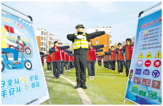 今年12月2日是第十四个“全国交通安全日”,河北省邢台市公安局交管支队在河北机电职业技术学院开展以“文明交通 礼行天下”为主题的宣传教育活动。图为交警带领学生学习交通指挥手势。 本报记者 周宵鹏 本报通讯员 崔信行 摄