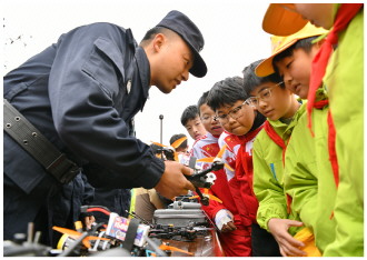 近日,安徽省阜南县公安局特警大队邀请玉泉小学学生走进警营,民警通过实物展示、互动交流等多种方式,展示了警用无人机等新型警务技术装备,让学生沉浸式体验科技强警成果。图为民警向学生讲解警用无人机的操作方法。 本报通讯员 徐丰 吕乃明 摄