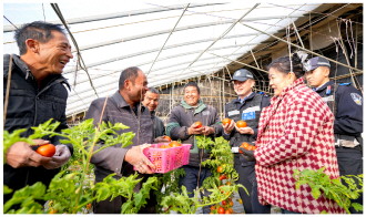 近日,新疆维吾尔自治区沙雅县公安局古勒巴格镇派出所民警走进辖区蔬菜大棚,向种植户开展法治宣传,为“大棚经济”健康发展筑牢安全屏障。图为民警与种植户面对面交流,了解他们在生产经营中的需求与困难。