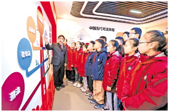 近日,江苏省淮安市中级人民法院举办开放日活动,邀请淮阴师范学院第一附属小学学生走进法院参观青少年法治教育基地。图为法院干警向学生们讲解法律知识。 本报记者 罗莎莎 本报通讯员 马盼攀 王昊 摄