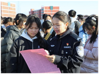 陕西省定边县公安局近日组建的“金盾护苗宣讲团”在县职教中心(实验中学)开展校园法治巡回宣讲。图为“金盾护苗宣讲团”成员给学生普及相关法律知识。 本报记者 孙立昊洋 本报通讯员 陈春苗 摄