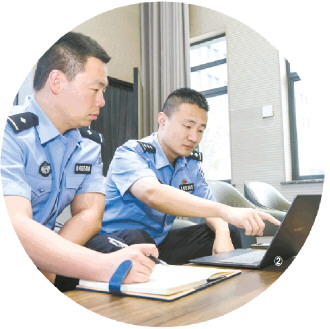 图① 邱旭斐(右)在侦查中心与同事商议一起案件研判路径。