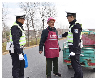 ▲ 12月16日,安徽省宿松县公安局交通管理大队民辅警深入农村,向老年人开展冬季交通安全宣传提示。图为民警向老年人赠送交通安全反光围裙。 本报通讯员 李政平 摄