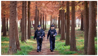 12月11日,浙江省台州市公安局黄岩分局北洋派出所民警在上垟乡白鹭湾湿地公园巡查。 本报通讯员 喻跃翔 摄