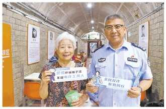 | 图为何宏亮和群众一起宣传反诈知识。