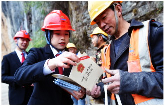 近日,重庆市奉节县人民法院旅游巡回法庭干警以瞿塘峡危岩整治与石漠化治理为契机,深入施工工地开展专题普法。图为干警在危岩整治现场向工人讲解长江保护法。 本报记者 战海峰 本报通讯员 高阳 唐华强 摄