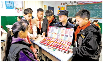 ▲ 连日来,江西省分宜县公安局组织民辅警深入辖区校园,开展禁毒宣传活动。图为12月24日,民警在杨桥镇中心学校向学生宣讲禁毒知识。