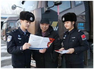 ▲ 近日,吉林出入境边防检查总站临江出入境边防检查站组织开展普法宣传活动。图为民辅警为过往司机讲解《吉林省边境管理条例》。 本报记者 张美欣 本报通讯员 宫伟诚 摄
