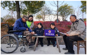 近日,浙江省长兴县公安局煤山派出所将“移动警务室”搬进辖区村落,为村民现场办理户籍业务。 本报通讯员 方金华 摄