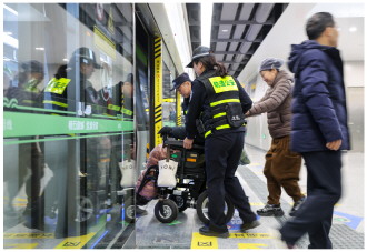 12月27日,山东省济南市地铁4号线、8号线和6号线东段正式开通运营。济南市公安局轨道公交公安局位里庄派出所组织民警在地铁站巡逻防控、服务群众,护航地铁通车运行。图为民警协助行动不便的老人上车。 本报通讯员 赵鹏宇 摄