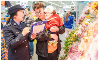 近日,江苏省海安市公安局城南派出所组织民警走进辖区商超,开展“面对面”反诈宣防活动,帮助群众筑牢财产安全防线。图为民警在向顾客介绍反诈常识。 本报记者 罗莎莎 本报通讯员 翟伟凯 摄