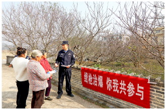 近日,江西省分宜县公安局组织民辅警深入辖区乡镇,开展“消除枪爆隐患、警民共创平安”主题普法宣传活动,通过现场讲解、发放宣传资料、以案释法等方式,向群众宣传缉枪治爆法律知识,提升群众安全防范意识。图为民警在洞源村向群众普及缉枪治爆法律法规。