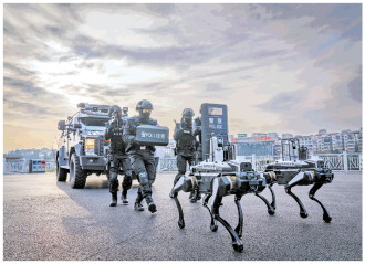 ▲ 四川省绵阳市公安局特巡警支队特警大队以智能装备赋能实战练兵,开展人机协同实战化演练。图为1月5日,特警队员与警用机器狗协同配合,模拟复杂环境下的搜捕、抓捕任务。 本报通讯员 唐超 摄