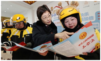 1月7日,安徽省淮北市总工会邀请淮北市人民检察院检察官走进工会驿站,结合劳动争议解决、劳动者权益保障、法律援助等问题,向快递员、外卖员等新就业群体宣传工会法。图为检察官向外卖员讲解工会法知识。 本报通讯员 张锋 摄