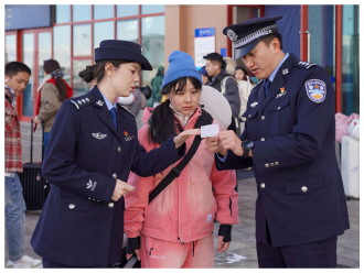 新年伊始,首趟“中国雪都·我的阿勒泰”号列车从乌鲁木齐准点抵达阿勒泰站。连日来,乌鲁木齐铁路公安局奎屯公安处阿勒泰站派出所紧扣服务为民初心,协调开通地方直达雪场专车、增设雪具临时存放点、设立便民服务岗,全方位保障旅客平安有序出行。图为民警为游客发放安全提示卡。 本报记者 潘从武 本报通讯员 张艳军 摄