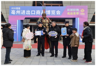 近日,安徽省亳州市公安局高新分局民辅警走进亳州进出口商品博览会暨新年购物节现场,开展“全民反诈”主题宣传。图为民辅警向市民宣讲反诈知识。 本报通讯员 程克强 董璇 摄