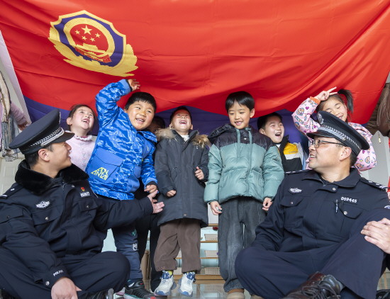 ▲ 1月7日,在第六个中国人民警察节到来之际,上海市公安局崇明分局竖新派出所民警走进辖区幼儿园开展“警营开放日”活动。图为民警与孩子们一起在警旗下合影留念。