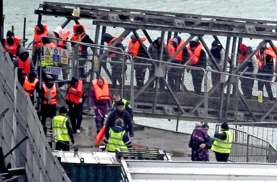 | 当地时间2025年5月21日,英国多佛,从法国试图穿越英吉利海峡的移民被边境部队船只“游骑兵”号救起后,在多佛码头下船。 CFP供图 |