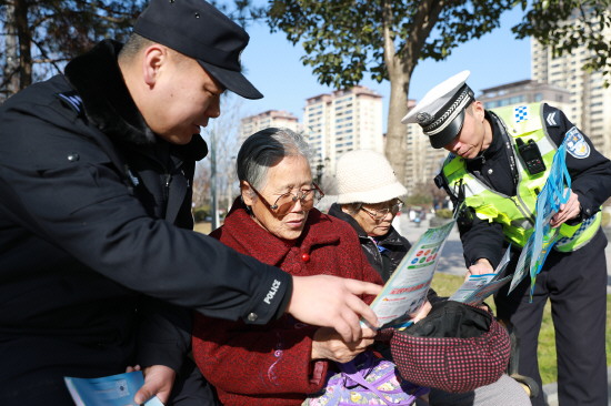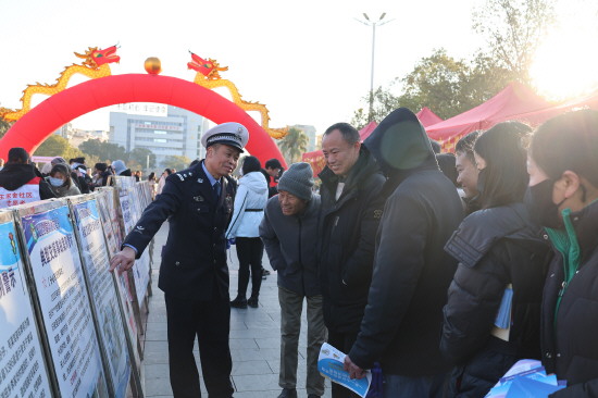 图② 近日,陕西省富平县公安局组织基层派出所民辅警在全县范围内开展“四十载守护平安·110勇毅前行”主题宣传活动,向群众发放安全防范相关法治宣传资料。图为民辅警向群众讲解安全防范知识。 本报通讯员 刘苍锋 刘启勋 摄