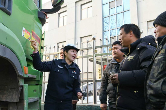 图② 安徽省含山县公安局交管大队近日组织民警走进货运企业,开展交通安全宣传。图为民警向驾驶员讲解冬季行车安全注意事项。