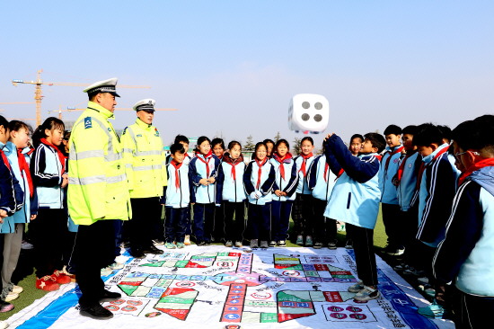 图① 近日,山东省枣庄市公安局峄城分局交警大队民辅警走进峄城区匡衡小学,开展交通安全进校园主题宣传。图为民警指导学生们体验交通安全游戏棋。