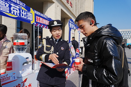 近日,南昌铁路公安处南昌站派出所联合铁路特警、江西省妇联等单位,在南昌站共同举办出行安全普法活动,护航平安出行路。图为民警在活动现场向过往旅客开展“赠茶送法”服务。 本报记者 黄辉 本报通讯员 沈鹏 摄