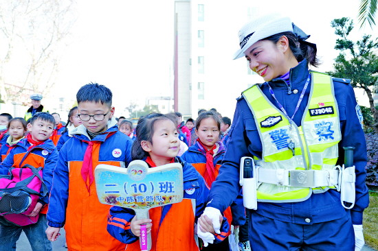 湖北省襄阳市公安局交管支队三大队担负着辖区三十四所学校、一百零三处护学岗执勤任务,他们用坚守和责任为学生们撑起了一片安全天空。图为一月十五日,护学岗执勤民警护送孩子们过马路。 本报通讯员 贺瑞明 梁正 摄