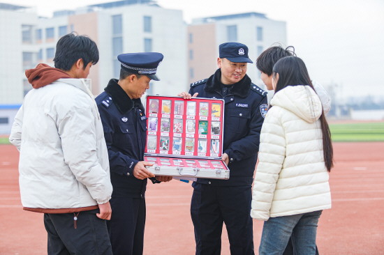 1月14日,安徽省亳州市公安局谯城分局民辅警走进辖区学校,为同学们带来一堂内容扎实、形式生动的禁毒教育课。图为民辅警向学生展示伪装成“奶茶、邮票”等仿真毒品模型。 本报通讯员 张子晨 摄
