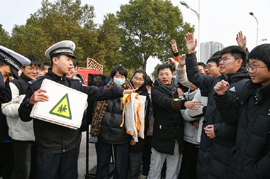 | 安徽省含山县公安局交管大队近日组织民警走进含山中学,开展以“知危险、会避险——交通安全记心间”为主题的交通安全宣传活动。图为民警与学生进行交通标识竞答互动。