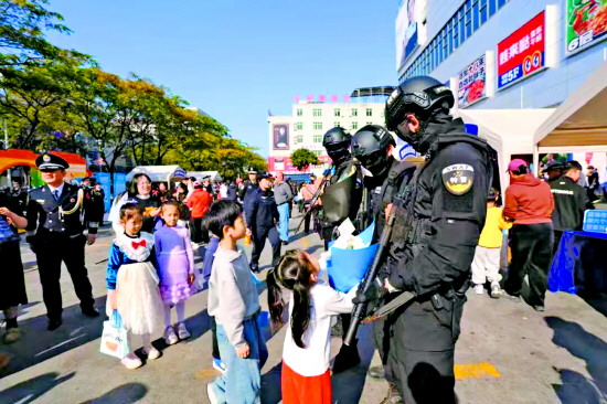 ▲ 近日,海南省琼海市公安局举行“警营开放日”活动。活动现场分为展示、问答、游戏三个板块,吸引市民群众积极打卡。图为参加活动的小朋友向民警送花。 本报记者 邢东伟 翟小功 本报通讯员 文德志 摄