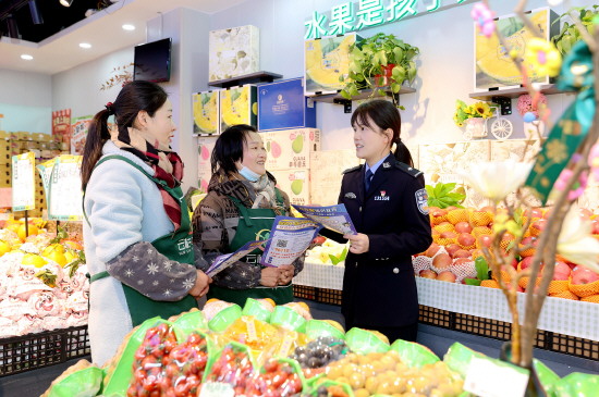 为增强群众反诈意识,近日,江苏省宿迁市公安局宿城分局组织民警深入社区向群众面对面宣讲反诈知识。图为民警在水果店讲解防范电信诈骗知识。 本报记者 罗莎莎 本报通讯员 王力 摄