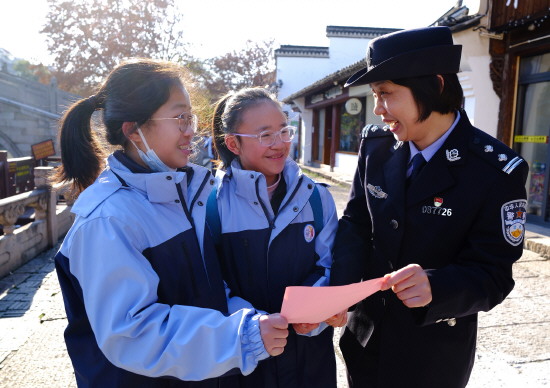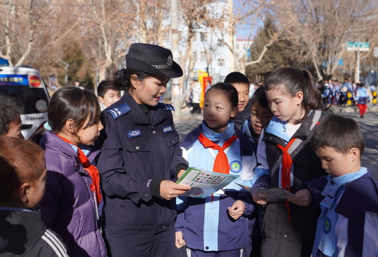 为提升青少年识毒、防毒意识,近日,新疆维吾尔自治区阿图什市公安局民辅警在辖区学校门前开展“校园门口禁毒微课堂”活动。图为辅警为学生们讲解毒品的种类和危害。 本报记者 潘从武 本报通讯员 司比努尔·艾克白尔 摄