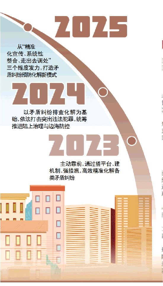 □ 本报记者 马艳 □ 本报通讯员 孔莉 唐贵斌 滨海而立承千年文脉,向海而兴护万家安宁。 广西壮族自治区钦州市,一座坐落于北部湾北岸的滨海运河城市,1400余年的历史积淀正与世纪运河的建设热潮交相辉映,平安建设与城市发展同频共振。 锚定“建设更高水平平安钦州”的目标,钦州聚焦护航重大工程、保障支柱产业、筑牢边海防线等重点工作,以系统思维织密社会治安综合治理防控网,为滨海运河城市高质量发展筑牢安全屏障。 2023年: 精准护航重大项目 2023年,钦州迎来平安建设新突破——成功获评“全国市域社会治理现代化试点合格城市”,经验做法《资源整合 联防联控 完善西部陆海新通道治安防控体系》入选65个“全国市域社会治理现代化试点优秀创新经验”。 这份荣誉的取得,源于钦州政法部门围绕中心、服务大局的实干担当,更离不开扎根一线的法治实践。 2022年8月28日,“世纪工程”平陆运河项目开工建设。运河建设,平安为先。重大工程推进到哪里,政法服务保障工作就延伸到哪里。 在灵山县旧州镇平陆运河马道枢纽建设现场,紧贴施工一线的“马道法治驿站”成为保障平陆运河工程推进的综合性法治保障前沿阵地。“法治驿站”整合法官、检察官、民警、调解员力量常驻,提供政策咨询、纠纷调解、法律服务等“一站式”服务。 “发展的前提是平安稳定,发展的脚步越快,平安的基石就要越牢。”灵山县委常委、政法委书记黄高钊介绍说,该县政法机关闻令而动,主动靠前,通过搭平台、建机制、强措施,高效精准化解各类矛盾纠纷,有力保障项目和谐征搬、妥善安置、顺利建设。 面对平陆运河穿境而过的情况,灵山县旧州镇同步开展“平安家访”。村级每周发布家访公告,来自乡镇和县直单位的干部相继走访全镇30个村(社区),收集矛盾纠纷线索与民情诉求,建立起“村级排查—片区调解—镇级研判—县级调度”四级处置链条。 平陆运河建设涉及钦州市公安局文峰派出所辖区52户197人搬迁,情况复杂、任务艰巨。93岁的冯奶奶在运河边生活了一辈子,对故土怀有深厚情感。 为解开老人的心结,社区民警连续13天登门陪伴,耐心向老人描绘平陆运河建成后,通航兴业、惠及子孙的长远图景,让老人理解搬迁不仅是支持国家重大工程,更是为后代铺就幸福生活之路。冯奶奶听后,不仅同意搬迁,还主动加入动员队伍,帮助说服邻里支持搬迁工作。 文峰派出所党支部与平陆运河集团(标段)党组织结对共建,精心打造“运河红帆、文峰先锋”党建品牌,6名社区民警全部进入社区“两委”班子,实现从警务工作“局外人”到“自家人”、从“上门办事”到“在家理事”的转变。 2024年: 筑牢边海安全防线 作为滨海城市,钦州海岸线绵长。2024年,钦州以矛盾纠纷排查化解为基础,依法打击突出违法犯罪,统筹推进陆上治理与边海防控。 在矛盾纠纷化解领域,钦州将社会治安综合治理触角延伸至基层末梢。钦北区大寺镇依托镇村两级党组织在群众聚集点设置21个“书记接访室”,各级党组织书记主动公开联系方式,对群众反映的问题建立问题、责任、销号“三清单”制度,对矛盾纠纷建立“书记评理团”开展调解,推动党组织书记“真管事”“解决事”“能干事”。 钦北区人民法院大寺法庭在设立壮语巡回法庭试点汉壮双语审判的基础上,于2022年6月设立钦北区法院民族团结巡回法庭,全面推行普通话+本地民族语言的双语审判,组建“通民语、晓民俗、专业强”的双语审判团队,入驻4个乡镇综治中心,织密多元解纷安全网。2024年,法庭新收案件539件,同比下降19.91%。 文峰派出所创新“智慧门牌+巡防联动”模式,整合专业警力与群防群治力量,积极为群众办理民生实事,2024年,该所投诉响应率、办结率和满意率达100%,刑事治安案件数量保持下降,用实际行动守护街头巷尾的平安。 面对新时代平安工作的新挑战、新要求,钦州聚焦海上违法犯罪痛点,将“打击”与“防范”职能落到实处。 在钦南区辣椒槌村,当地整合村“两委”干部、渔民志愿者、网格员力量组建“潮汐巡逻队”,根据潮汐规律,对重点岸段实施不间断的巡逻监控,实现“岸线有人守、海上有人巡”。近三年来,全村无个人极端案事件,无走私、偷渡等涉边违法犯罪案件发生。 钦南区龙门港镇成立平安渔业示范镇建设专班,对乡镇船舶实行网格化管理,逐船精准摸排“三无”船舶,联合多部门严厉打击非法捕捞等行为。 2024年,钦州市重点警情下降明显,案件打击效能提升明显,全市发生电诈刑事案件数、群众损失数、涉案“两卡”数分别同比下降,降幅均为广西第一;侦破的特大海上走私专案入选公安部10起打击海上走私典型案例;侦破跨境走私假烟案,涉案金额达2亿多元。 2025年: 规范综治中心建设 2025年,钦州将社会治安综合治理中心规范化建设作为核心抓手,推动治理资源整合、效能升级,构建“一站式受理、一揽子调处、全链条解决”的工作体系,让社会治安综合治理更高效、更暖心。 走进浦北县社会治安综合治理中心,宽敞明亮的大厅内,诉讼服务、检察服务、公共法律服务等5大平台集中整合,实现“只进一扇门、最多跑一地”的综治服务新模式。 在浦北县综治中心办公室里,“公正调解解民忧 为民服务暖人心”“跨域协作显担当 千里寻亲续亲情”等15面锦旗,见证了群众对综治中心工